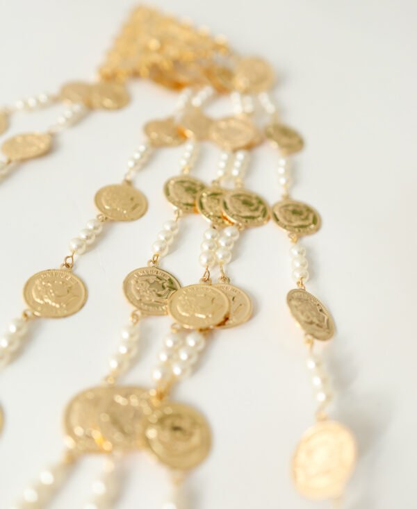 La tenue est complétée par une large ceinture structurée : partiellement cartonnée pour maintenir la forme, elle est dotée d’un long ruban permettant de l’enrouler plusieurs fois autour de la taille ou de la porter de différentes manières, selon le style et l’effet désirés.