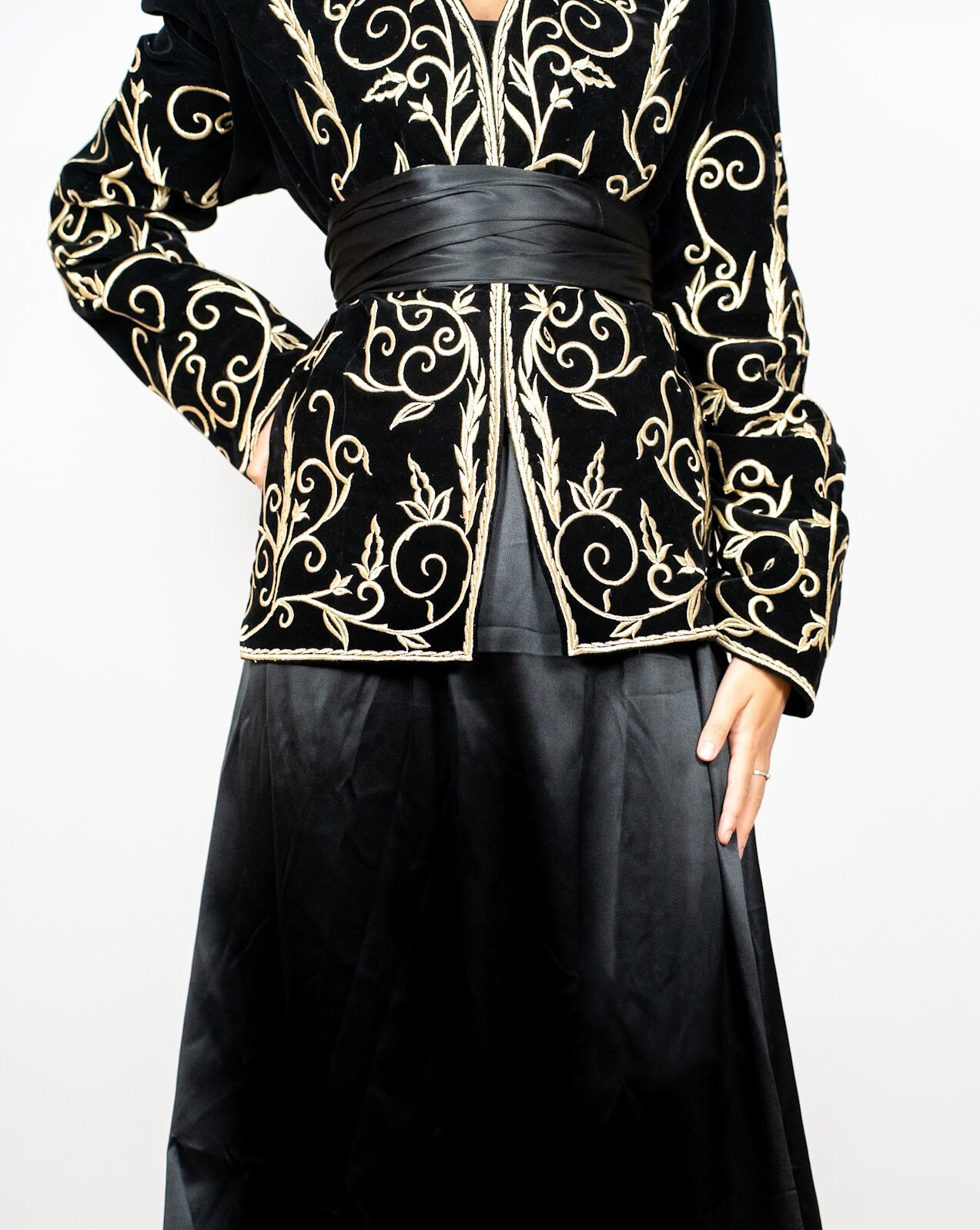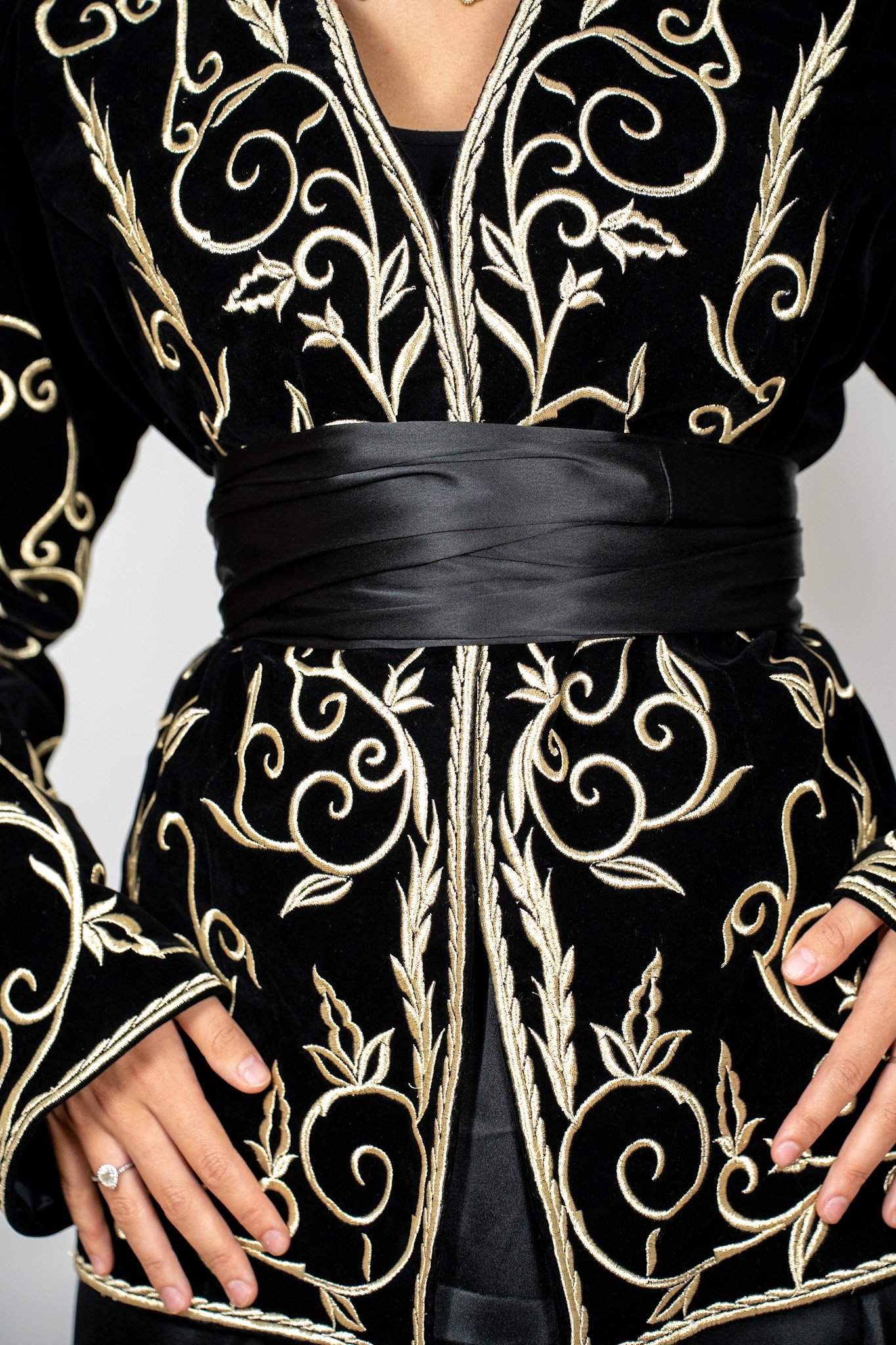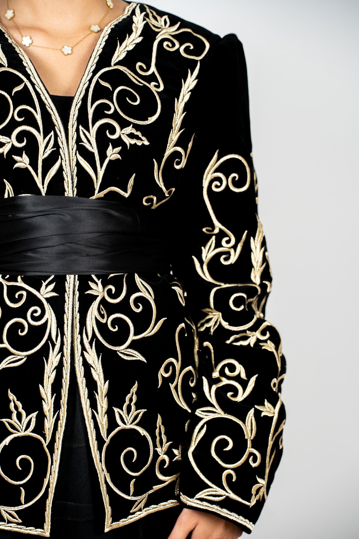 Ce modèle s’inspire directement du karakou algérien, pièce emblématique de l’artisanat traditionnel. La veste, confectionnée en velours de daim richement brodé, se distingue par ses motifs dorés raffinés qui apportent une touche de modernité.