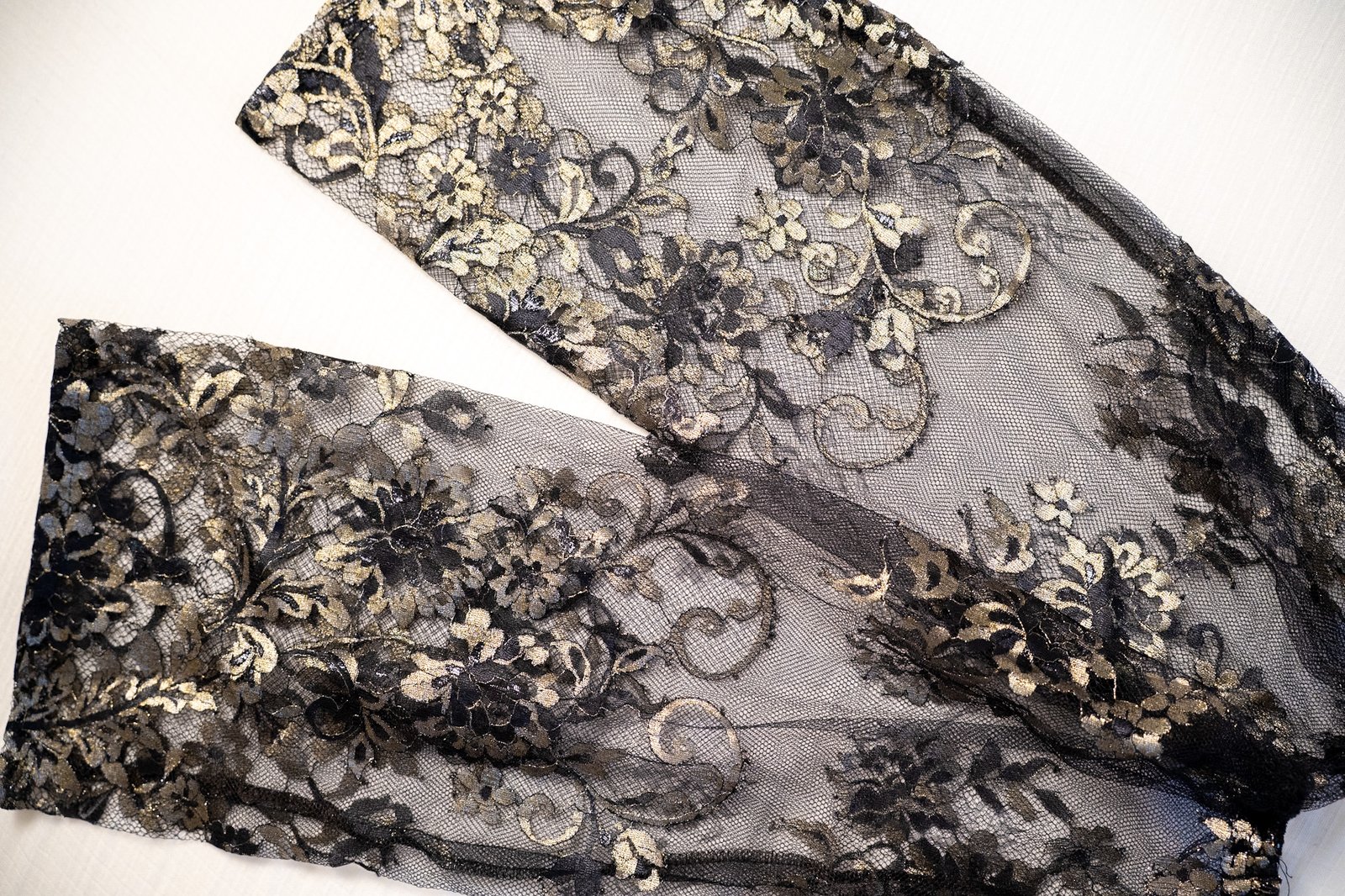 Ces manches en dentelle de Calais, délicatement travaillées de motifs floraux noirs et dorés, apportent une touche de sophistication unique à votre tenue. Leur transparence subtile et leur richesse de détails en font l’accessoire parfait pour transformer une robe sans manches en un look élégant et raffiné.